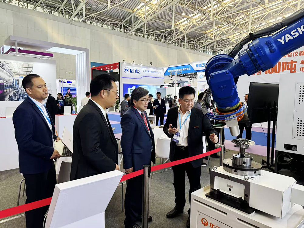 中国工程院院士、可靠性系统工程技术专家王自力(右二)参观华云TM3展台,华云公司董事长赵显华(右一)为其讲解华云TM3机器人,代替人工抛光并强化叶轮根部,提高叶轮的疲劳寿命。