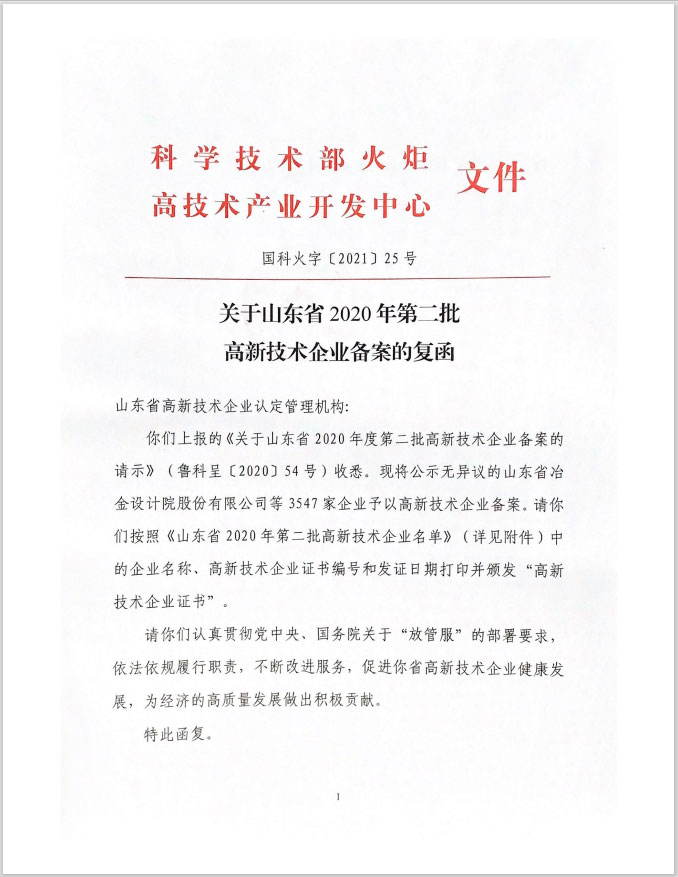 《关于山东省2020年第二批高新技术企业备案的复函》